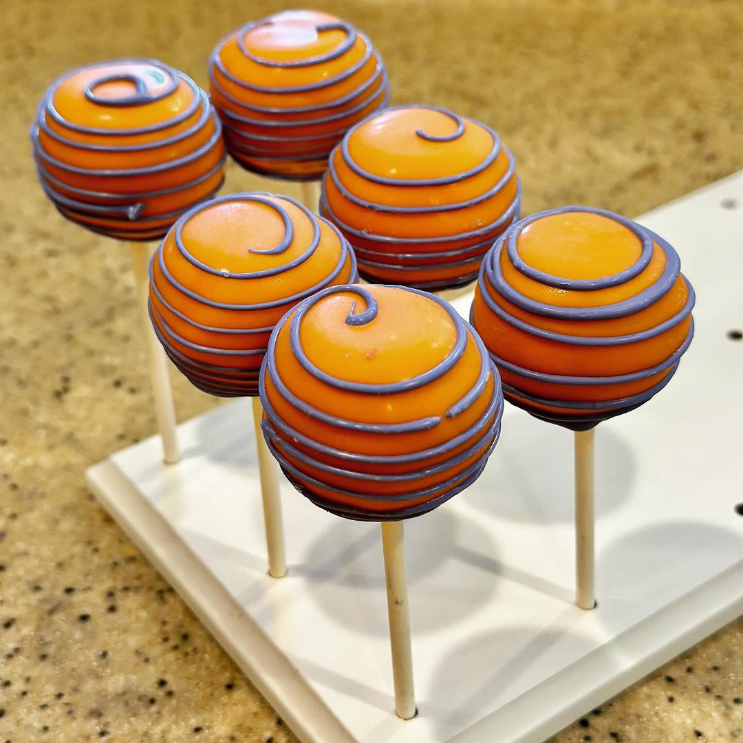 These small treats consist of cake and frosting mixed together. rolled into a ball shape, and put on a stick (like a lollipop), then coated in some type of chocolate.